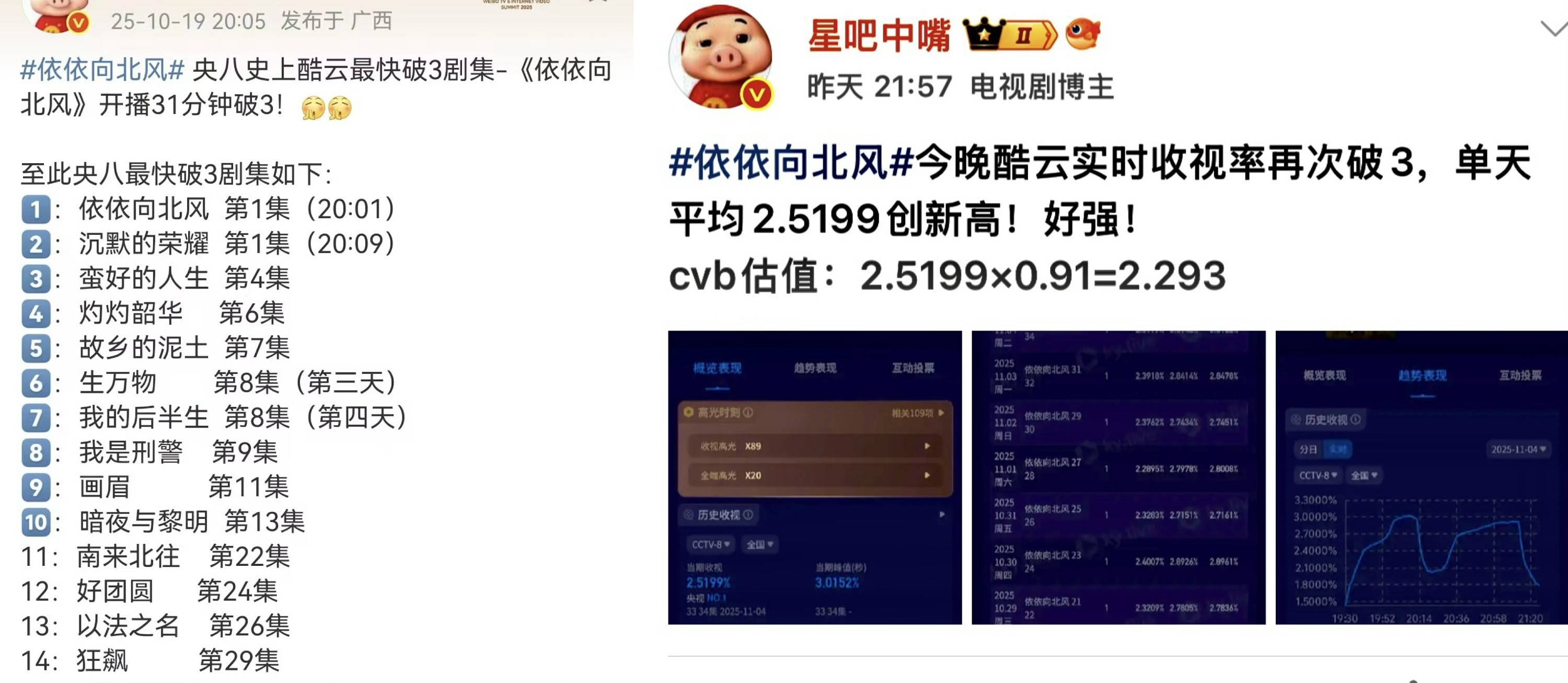 《依依向北风》没有像《沉默的荣耀》《生万物》等那些头部大剧演员阵容,也没有即将接档播出的《四喜》那样宣传力度,更没有像《臧海传》《长安的荔枝》等受众捧的大IP,却在重重大剧包围下突围,取得爆款好成绩。首播当日便破记录,成为酷云数据央视近几年收视率最快破3%电视剧,并在11月4日播出33集时,收视率再次破3%,播出期间更是保持全国收视冠军和居高不下的网络热度,全网全端两周播放量达到近6亿,猫眼、欢网大数据定位S+项目。由此可见,“三无”电视剧也是有观众市场的,只要制作方和剧组主创有诚意。