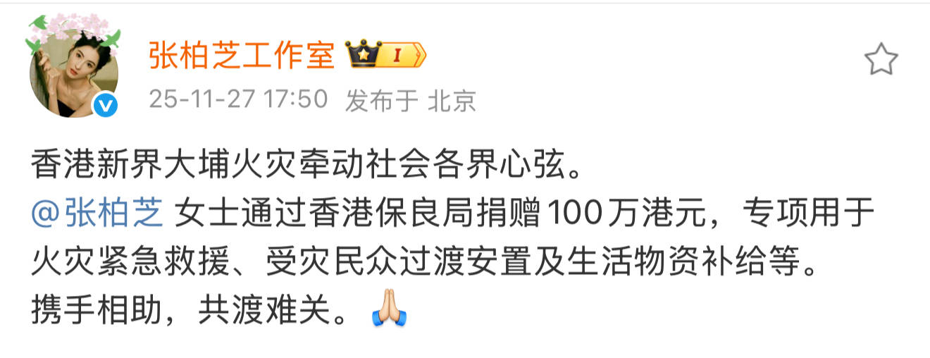 11月26日下午,香港大埔区宏福苑发生火灾,灾情牵动社会各界心弦。作为香港演艺界人士,演员张柏芝女士也始终密切关注灾情及同胞状况,并通过工作室宣布捐款100万港元,用于火灾应急救援及人道救助。该笔善款将专项捐赠予香港保良局,主要用于紧急救援、受灾群众过渡安置及基本生活物资补给等工作。